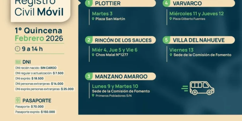 Con el propósito de acercar servicios esenciales a la ciudadanía, el Registro Civil Móvil comenzará su recorrido por localidades del interior, facilitando la realización de trámites como la gestión de DNI, pasaporte y cambios de domicilio. El cronograma de visitas abarca la primera quincena de febrero, permitiendo a los ciudadanos acceder a estos servicios sin necesidad de desplazarse a las oficinas centrales.El martes 3 de febrero, el dispositivo móvil atenderá en la plaza San Martín de Plottier, brindando servicios a los vecinos de la zona. Posteriormente, del 4 al 6 de febrero, el Registro Civil Móvil se trasladará a Rincón de los Sauces, donde estará ubicado en calle Chos Malal Nº 1277, para atender a la comunidad.El recorrido continuará los días 9 y 10 de febrero en Manzano Amargo, en la sede de la comisión de fomento, situada en la calle Primeros Pobladores s/n. Además, los días 11 y 12 de febrero, el dispositivo estará en la plaza Gilberto Fuentes de la misma localidad. El horario de atención será de 9 a 14 horas, atendiendo por orden de llegada hasta un máximo de 50 trámites diarios.Para obtener más información sobre los requisitos necesarios para cada gestión, los interesados pueden visitar el sitio web oficial del Registro Civil en registrocivil.neuquen.gob.ar.