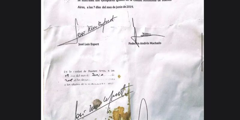 El documento, que se halló roto y manchado, fue reconstruido por peritos policiales y confirma que Machado había pactado el pago de un millón de dólares con Espert por presuntos servicios profesionales.