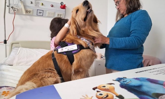Desde su puesta en marcha, Saru y Cora —dos golden retrievers entrenadas por “Las MacAnitas” junto a Ana Morinigo— visitan espacios verdes y salas pediátricas del hospital. En dos años acompañaron a 54 niñas, niños y adolescentes, logrando: